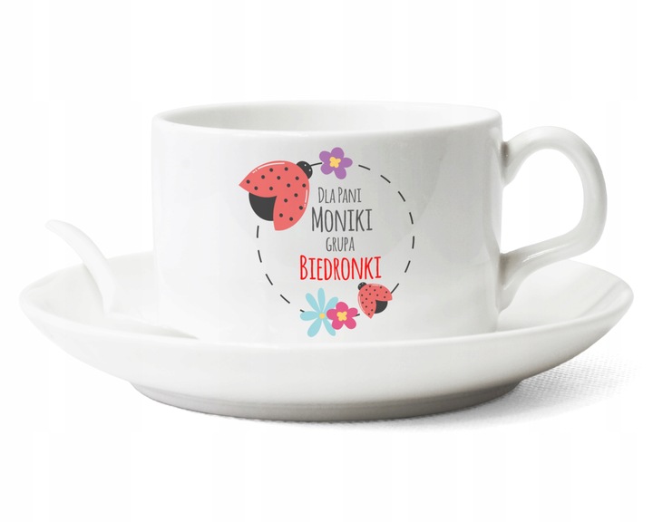 Gyönyörű szett, amely egy csészéből, egy tányérból és egy kanálból áll, bármilyen alkalomra elkészítve.