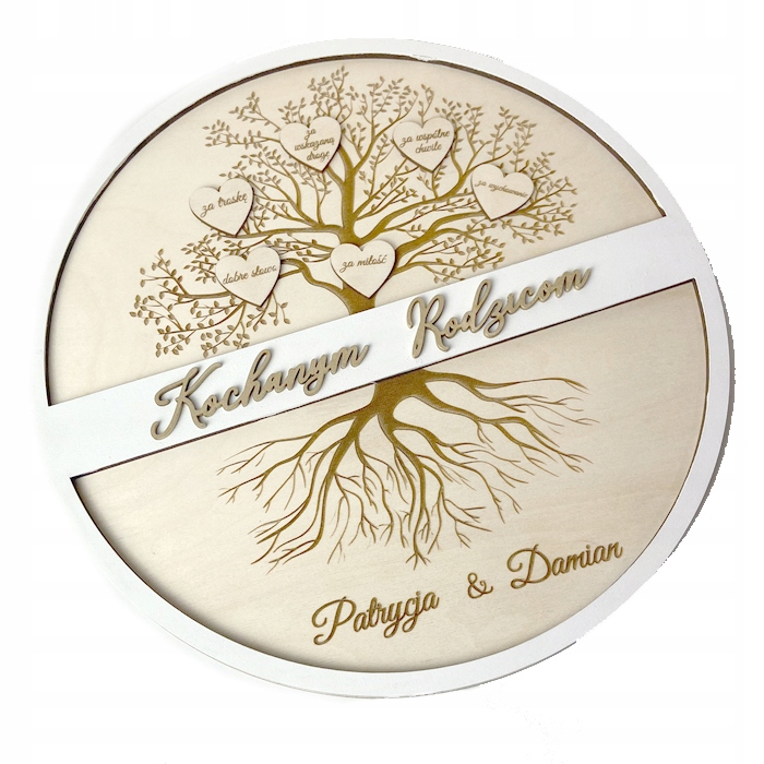 Személyre szabott fa gravírozott nevekkel és esküvői dátummal.