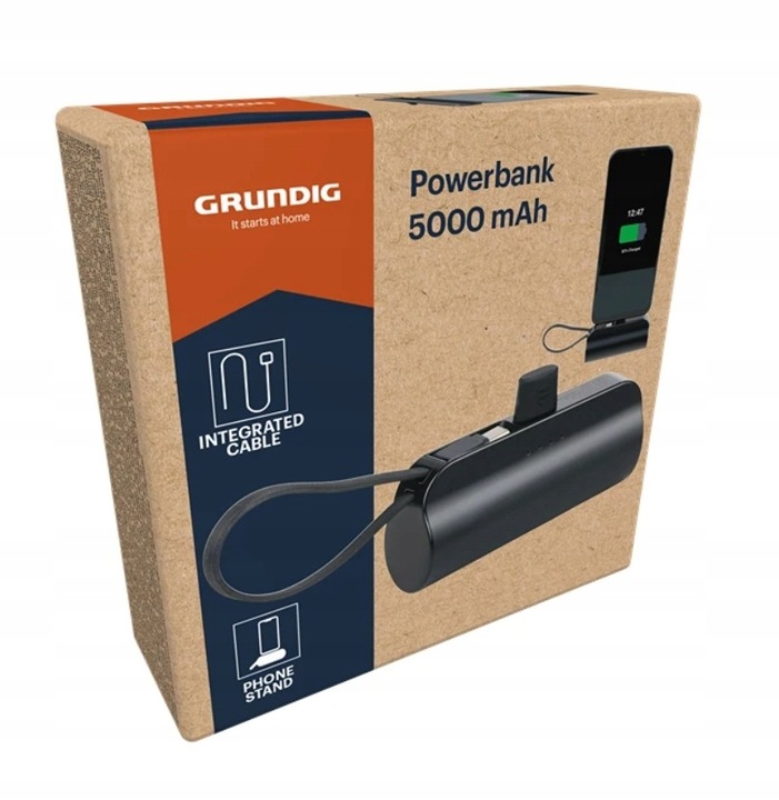 Grundig Powerbank 5000 mAh beépített Type-C kábellel, fekete