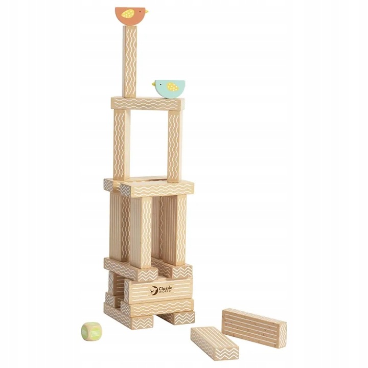 Madarak kirakása oktató játék a CLASSIC WORLD márkától lehetővé teszi, hogy számos különleges játékkal játssz - csak a képzelet szab határt! A játék 20 db építőkockát, 2 db madarat és egy dobókockát tartalmaz, melyek mindegyike bükkfából készült. Játssz a kirakással, és nézd meg, ki tud magasabbra repülni! Az ilyen típusú játékok fejlesztik a kommunikációs készségeket, fejlesztik a merészséget és a biztonságota gyerekekben!