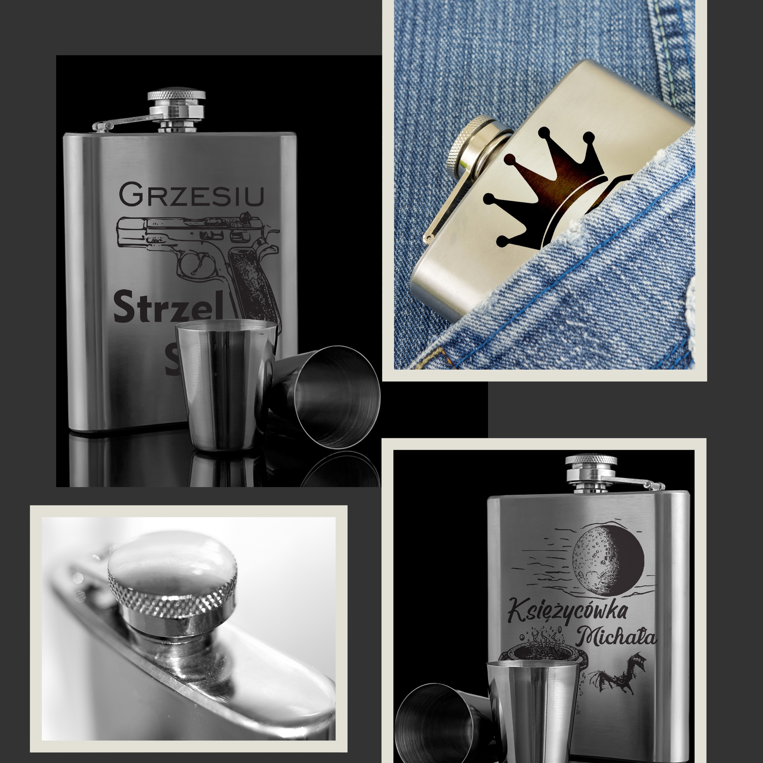 ⭐CSÍPŐ LOMBIK ACÉL 210 ML GRAVÍROZOTT + GRAVÍROZOTT DOBOZ (egyforma gravírozás a dobozon és a dobozon)+ 4 POHÁR + TÖLCSÉR + TOK