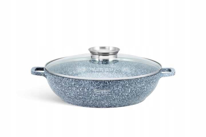 Kiváló minőségű serpenyő márvány bevonattal. Használható serpenyőként, alacsony fazékként és serpenyőként is. AROMA KNOB fém fogantyúval ellátott üvegfedéllel rendelkezik - bor, víz vagy aromás olaj alapú fűszerek öntésére alkalmas. Lehetővé teszi húsok és sok más étel sütését és párolását.