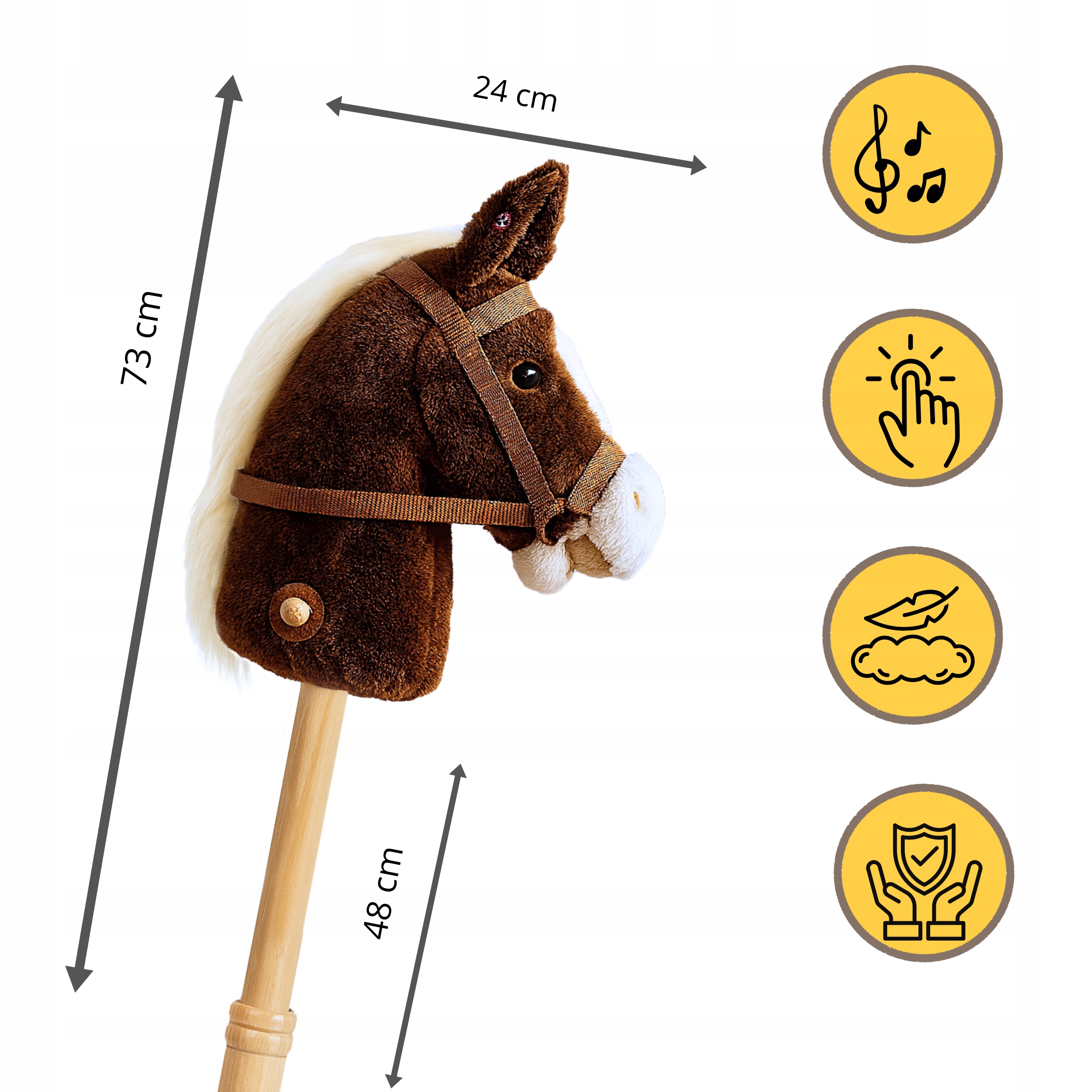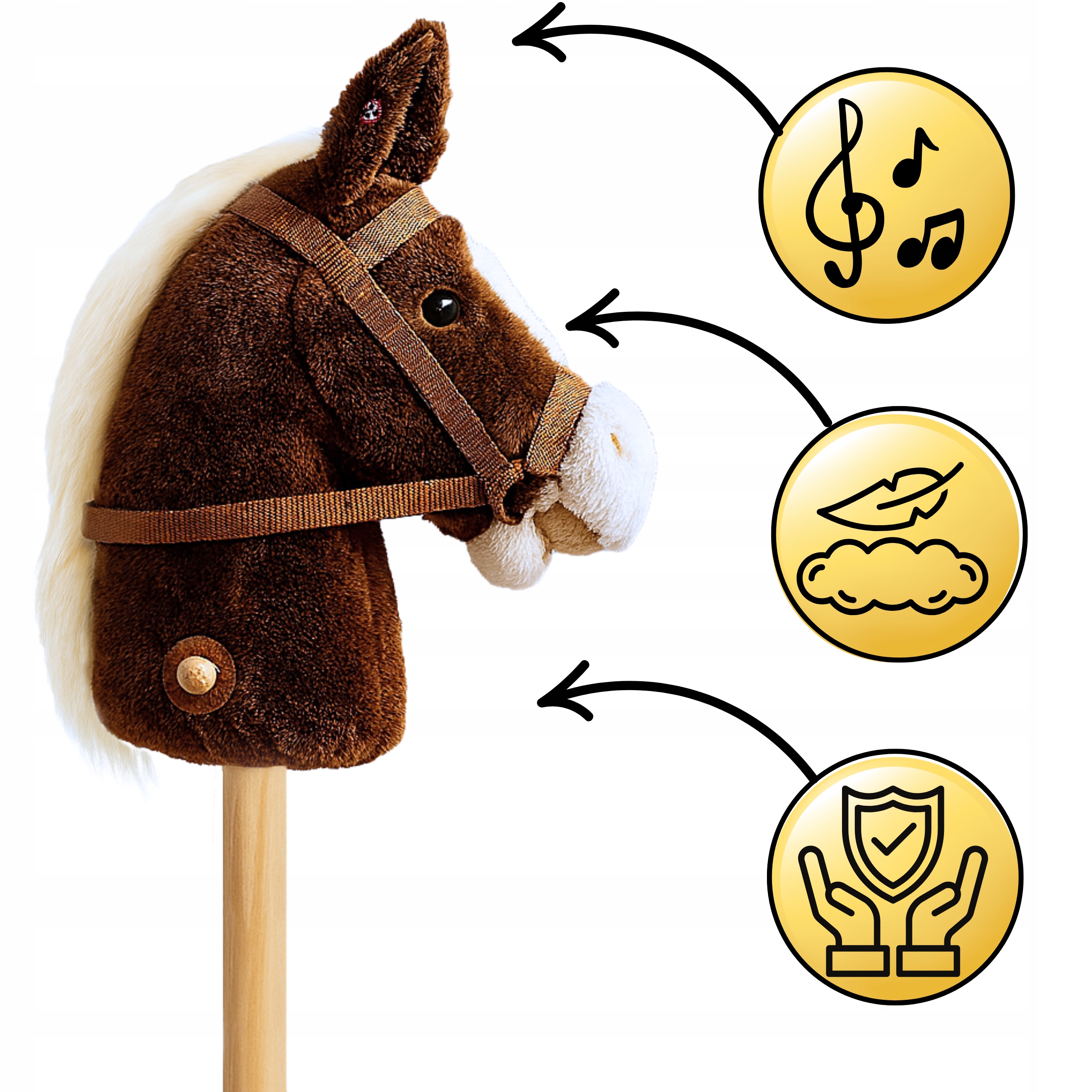 A ló feje kiváló minőségű, puha plüssből készült , amely kellemes tapintású és biztonságos a baba finom bőrének. A valósághű részletek , mint például a sörény és a kantár , igazi lóvá teszik a játékot. A fogantyúként szolgáló masszív műanyag bot gondosan kidolgozott a tartósság és a kényelmes használat érdekében.