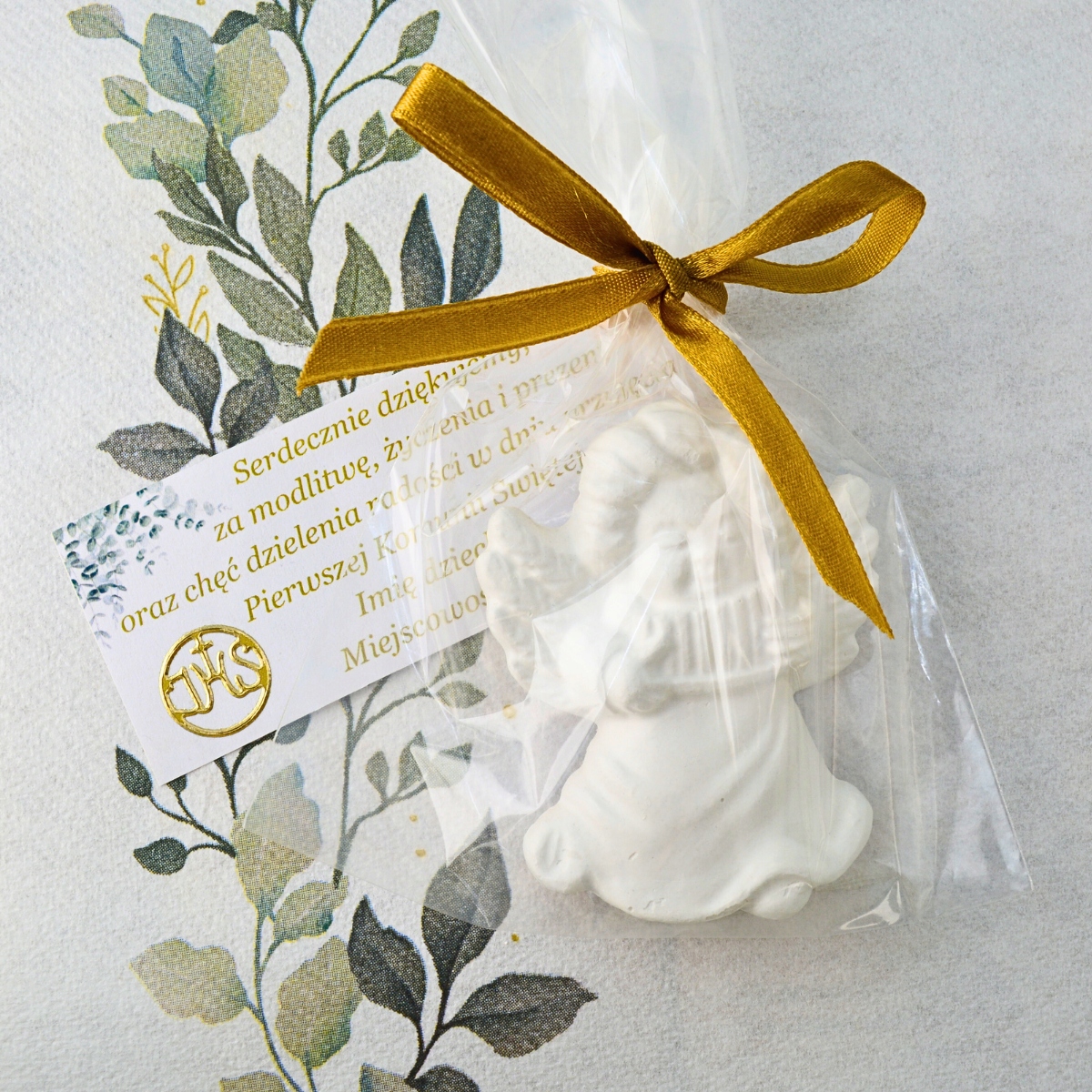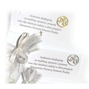 Tartalmaz egy celofán csomagolást, egy szalagot és egy köszönőkártyát a vendégek számára.