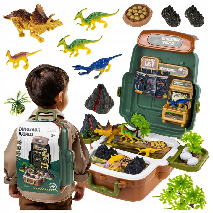 ✅MEGA XXL KÉSZLET – a hátizsákban 5 élethű dinoszauruszt, 3 tojást, vulkánt, fákat, sziklákat, pálmafákat és sok kiegészítőt találsz