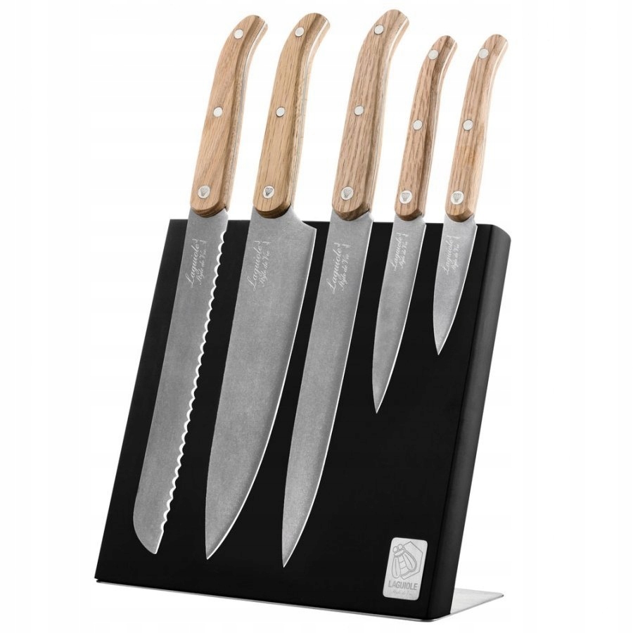 Elegáns Laguiole Style de Vie Oak konyhai késkészlet minimalista dizájnnal, amely lazán utal a hagyományos provence-i késekre. A készlet egy átfogó eszközkészletet tartalmaz, amely lehetővé teszi számunkra, hogy bármilyen típusú élelmiszerrel dolgozzunk. Találunk itt egy aprításra alkalmas szakácskést, egy hosszú szeletelő kést, egy precíziós univerzális kést, egy gyümölcs- és zöldséghámozó pairing kést és egy nagy kenyérvágó kést is. Minden modell rozsdamentes acélból készült , amely savas környezetben való fürdéssel készült, és tölgyfából készült markolattal van ellátva.