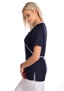 Klasszikus, fejre simuló pulóver, rövid ujjú, két zsebbel a csípőn. V-nyakkivágás szegéllyel díszítve, hátul megkötős fazonban. .