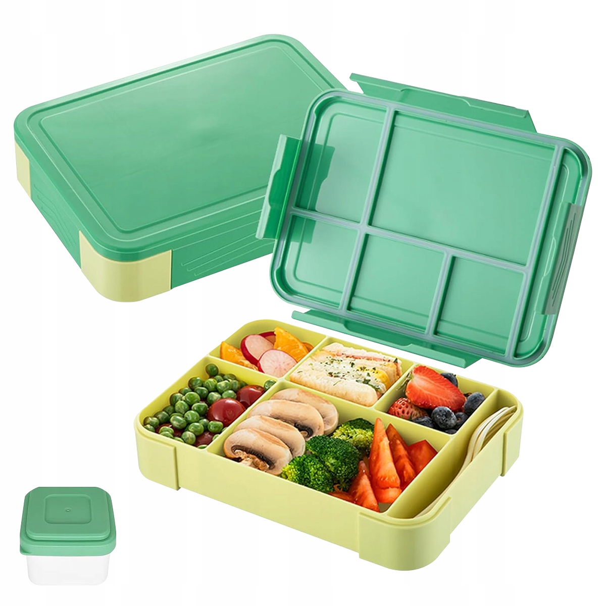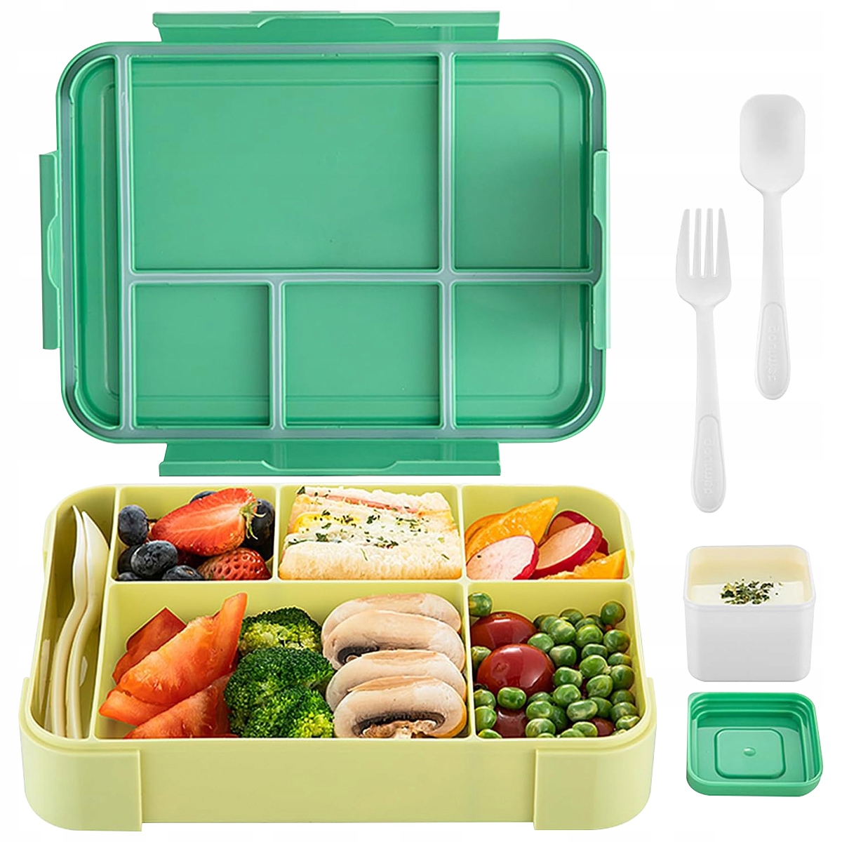 ✔ Ebéddoboz rekeszekkel a gyermekek számára - Az óvodások számára készült ebéddoboz 5 rekeszt tartalmaz, amelyek lehetővé teszik a főétel, a gyümölcsök, a snackek, a saláta, a szendvics és a szósz külön-külön történő felszolgálását. A csomag tartalmaz egy külön, fedővel ellátott szósztartót, valamint egy kés- és villakészletet is.